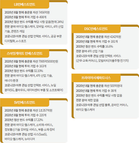 국내에서 내로라하는 스타트업 뒤엔 든든한 벤처캐피털(VC)이 있다. 게임 검은사막으로 명성을 얻은 펄어비스, 스타트업 대장주 마이리얼트립, 방탄소년단(BTS) ‘대박’의 빅히트엔터테인먼트(이하 빅히트), 코스닥 시장 대표 바이오주 에이비엘바이오… 각각 LB인베스트먼트(LB), 스마일게이트 인베스트먼트(스마일), SV인베스트먼트(SV), DSC인베스트먼트(DSC)가 초기 단계부터 자금을 조달하면서 키워낸 기업들이다.