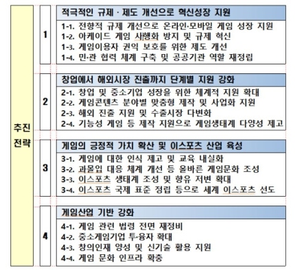 이번 계획에는 적극적인 규제·제도 개선으로 혁신성장 지원, 창업에서 해외시장 진출까지 단계별 지원 강화, 게임의 긍정적 가치 확산 및 e스포츠 산업 육성, 게임산업 기반 강화 등 4대 핵심전략과 16개 역점 추진과제가 담겼다.