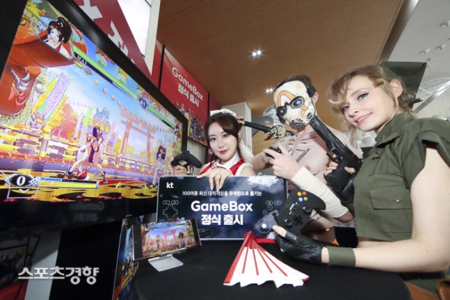 게임 캐릭터 복장을 한 모델들이 ‘게임박스’를 시연하고 있다.|KT