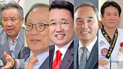 대한체육회장 선거가 석달을 남기고 달아오르고 있다. 이기흥 대한체육회장, 장영달 우석대 명예총장, 유준상 대한요트협회장, 강신욱 단국대학교 교수, 이동섭 전 국회의원(왼쪽부터)