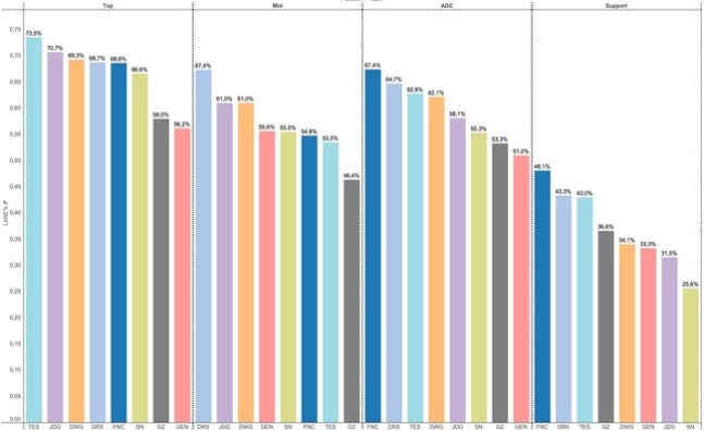 맵 전체에 영향력을 퍼트리는 것으로 잘 알려진 미드 라이너 ‘캡스’ 라스무스 뷘터(46.4%)를 필두로 탑 라이너 ‘원더’ 마틴 한센(58%), 원거리 딜러 ‘퍽즈’ 루카 페르코비치(53.3%), 서포터 ‘미키엑스’ 미하엘 뮐(36.6%) 모두 2~15분 기준 상당히 낮은 라인 관여율을 기록했다.