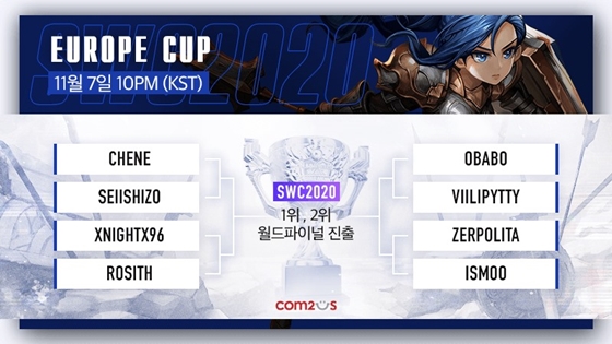 오는 11월 7일 오후 10시에 시작되는 유럽컵은 지난해에도 참가했던 베테랑이 대거 출전한다. 지난 2018년부터 매해 유럽컵에 진출해온 프랑스의 ‘CHENE’과 2017년부터 꾸준히 대회에 참가하고 있는 네덜란드의 ‘SEIISHIZO’가 맞붙고 신예인 독일의 ‘XNIGHTX96’과 지난 해 월드결선 4강 진출자인 프랑스의 ‘ROSITH’가 겨룬다.
