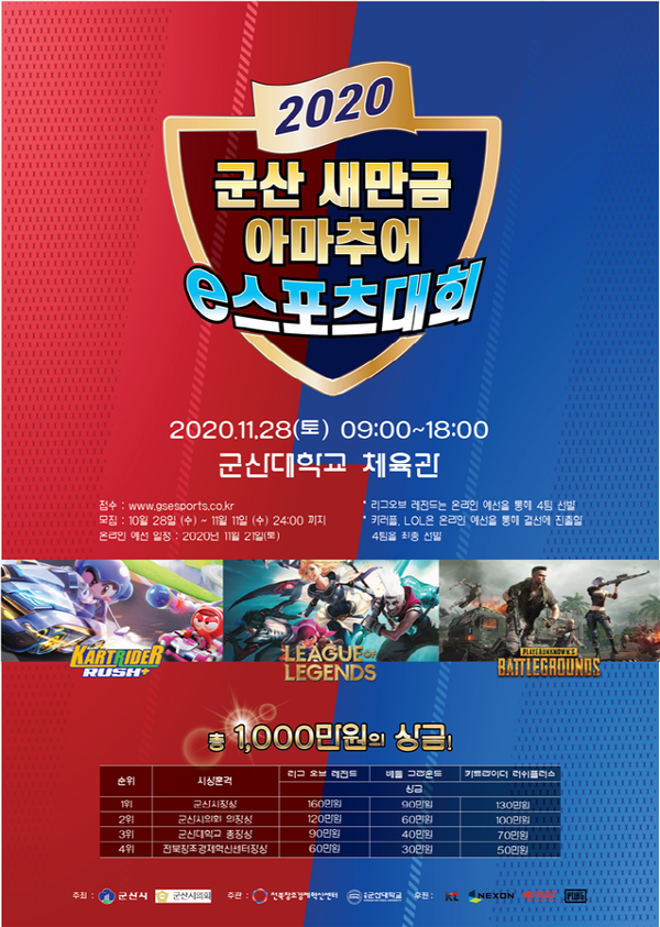 군산시가 주최하고 전북창조경제혁신센터와 군산대학교가 주관하는 ‘군산 새만금 아마추어 e스포츠대회’가 오는 11월 28일 군산대학교 체육관에서 개최된다.