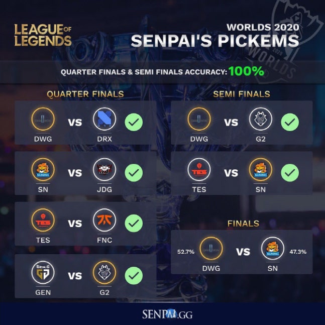 SENPAI가 처음부터 모든 롤드컵의 경기 결과를 맞힌 것은 아니다. 그룹 스테이지를 포함한 대회 전체적으로는 70%에 채 미치지 못하는 적중률이지만, 데이터 학습이 충분히 쌓인 이후인 8강 토너먼트부터의 예측은 백발백중으로 이어진 점이 눈길을 끈다.