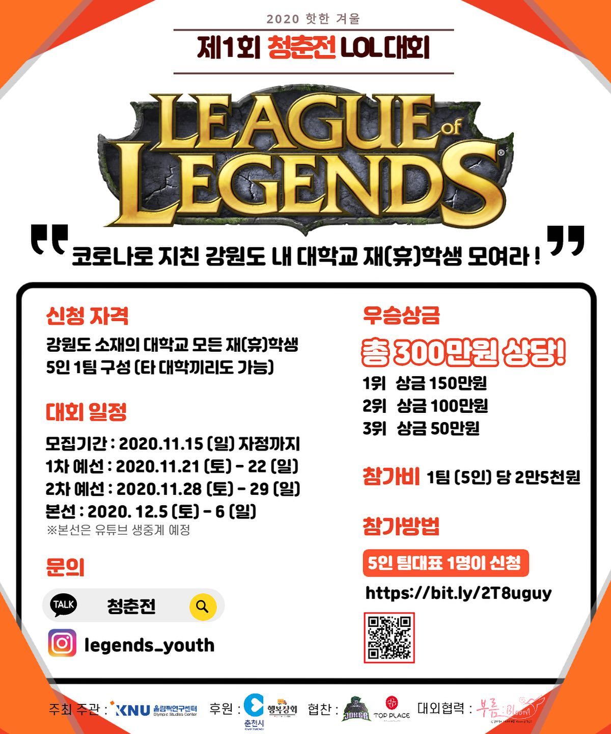 참가신청은 네이버 폼을 통해 팀 단위로 신청할 수 있으며, 대회에 관한 자세한 내용은 인스타그램(legends_youth)을 통해서 확인 가능하다.