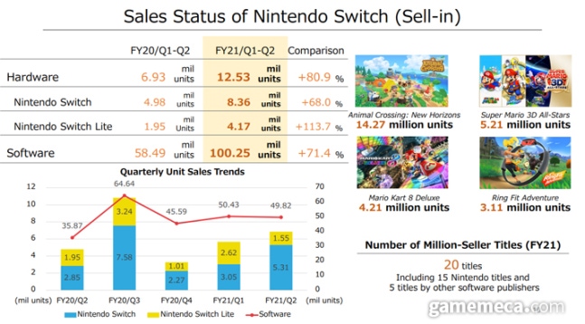 닌텐도 스위치는 현 세대 콘솔 중 유일하게 전성기를 누리고 있다. 여기에 모여봐요 동물의 숲이 인기를 끌며 2020년 스위치 하드웨어 판매량도 크게 늘어났다. 특히 3분기(2020년 7월~9월, 회계연도 기준 2021년 2분기)에는 스위치 전세계 출하량이 닌텐도 패밀리 컴퓨터(이하 패미컴)을 넘어섰다.