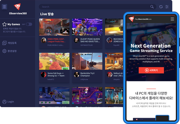 ‘옵져뷰360’은 국내 최초로 스트리밍을 통해 온라인 PC게임을 웹을 통해 모바일과 PC로 게임을 이용할 수 있으며, 이번 시범 서비스에는 검은사막, 던전앤파이터, 로스트아크, 피파4 등 총 9종의 온라인 PC게임을 플레이 할 수 있도록 지원하고, 각 장르에 최적화 된 가상패드와 게임패드를 제공한다.