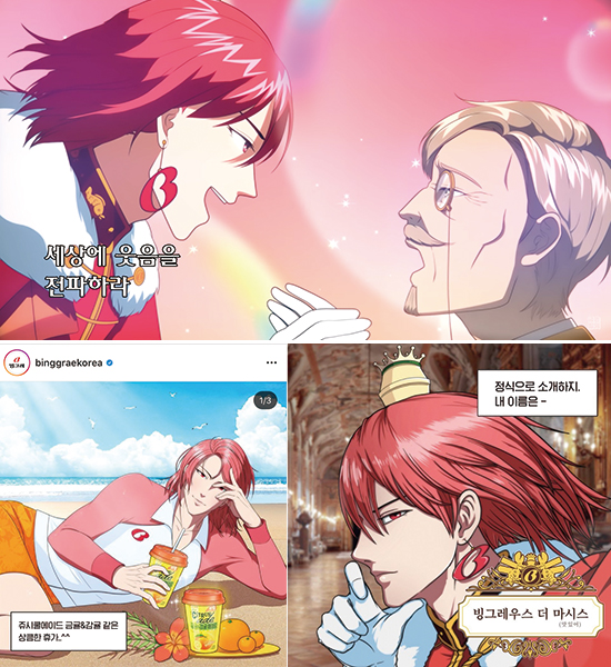 ‘빙그레 마케팅 담당자 퇴사설’, ‘빙그레 계정 해킹설’을 낳은 ‘빙그레 메이커’ 역시 MZ세대를 사로잡고 있는 대표적인 가상의 캐릭터 세계관이다. 빙그레 인스타그램에는 계정 운영을 전담하는 빙그레나라 차기 왕위계승자 ‘빙그레우스 더 마시스’의 등장을 시작으로, 비서 ‘투게더리고리경’, 빙그레우스 호위단장 ‘더위사냥’, 열쇠공 ‘끌레도르’ 등이 추가되며 빙그레 나라의 일면을 속속들이 공개되고 있다. 이들은 순정만화를 연상시키는 화려한 비주얼들을 뽐내며, 특히 ‘빙그레우스 더 마시스’의 경우 독특한 말투나, 그윽한 분위기의 셀피 사진, B급 감성의 웃음 코드를 보여준다. 최근엔 뮤지컬 배우 김성철과 콜라보한 OST ‘빙그레 메이커를 위하여’를 발표하는 등 본격적인 SNS 채널 마케팅에 박차를 가하고 있다. 그들의 활약(?) 덕분에 빙그레 인스타그램 공식 계정은 15만 명을 넘기며 새로운 팬덤을 형성케 하는 등 꾸준한 인기를 얻는 중이다.