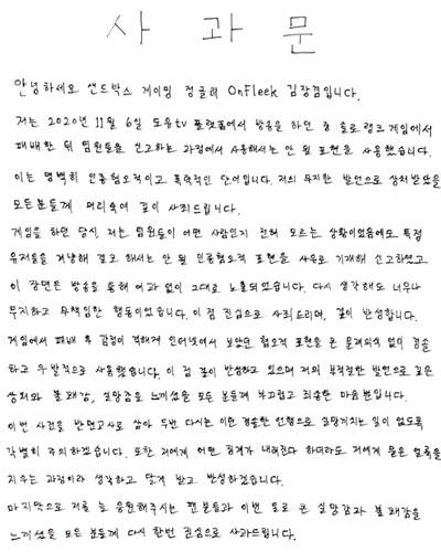 라이엇 게임즈는 지난 2020년 11월 6일경 “온플릭” 김장겸 선수가 개인 연습 도중 아군 플레이어를 신고하는 과정에서 부적절한 표현을 사용한 상황과 관련하여 LCK 규정 위반 여부를 검토했습니다.