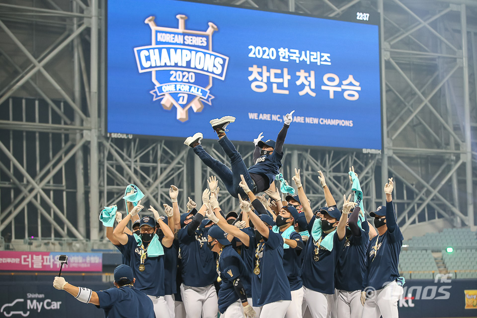 24일 서울 구로구 고척스카이돔에서 열린 2020 프로야구 포스트시즌 한국시리즈(KS) 6차전에서 엔씨 다이노스가 두산 베어스를 상대로 열린 경기에서 시리즈 전적 4승 2패로 우승을 확정지었다.