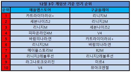 게임샷이 선정한 12월 3주 모바일 인기 순위는 신규 업데이트를 선보인 '미르4'와 '바람의나라: 연'이 주목됐다.