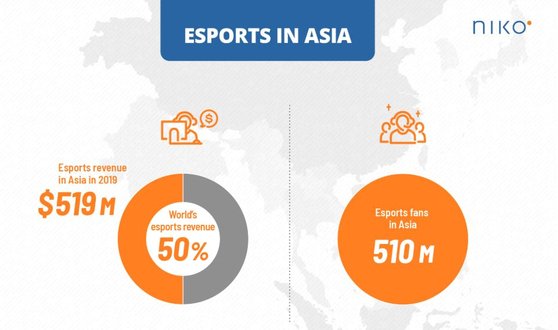 아시아 e스포츠 시장은 지난해 5억1900만 달러(약 6200억원)의 수익을 창출했다. 니코파트너스는 "전 세계 e스포츠 수익의 절반 규모이며, 대륙 단위로 나누면 아시아가 세계 1위"라고 전했다.