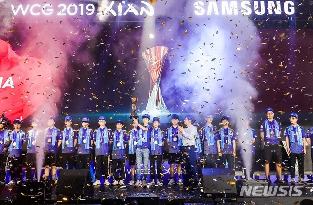 【서울=뉴시스】지난 21일 중국 시안시 취장신구 국제 컨벤션센터에서 열린 최고의 e스포츠 페스티벌인 WCG 2019 Xi'an이 성황리에 마쳤다. 개최국인 중국인 금메달 4개를 가져가면서 종합우승을 차지했다. 종합우승을 차지한 중국 대표 선수들이 우승 트로피를 들고 세리머니를 하고 있다. 2019.07.22. (사진=WCG 제공) photo@newsis.com