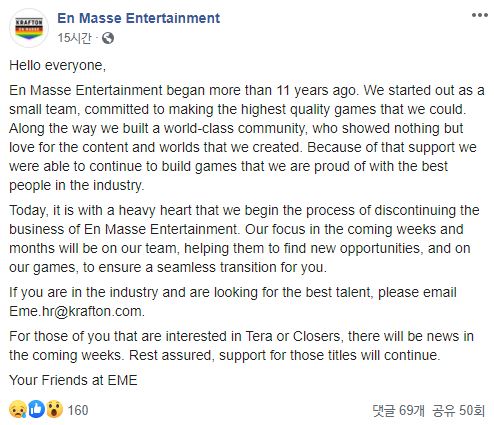크래프톤 북미 지사 ‘엔매스’(En Masse Entertainment)가 사업 중단 소식을 8월 18일 밝혔다.