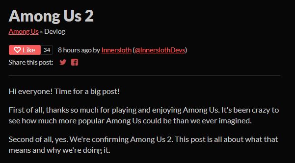 화제의 인디게임 '어몽 어스'의 속편 개발 소식이 공개됐다. 개발사 이너슬로스(Innersloth)는 18일 공식 블로그에서 '어몽 어스 2'를 개발한다는 소식과 그 배경을 전했다.