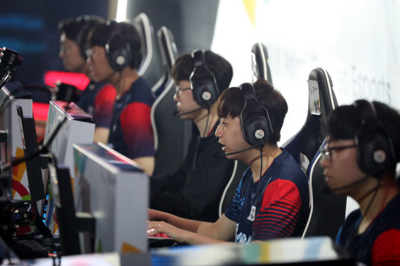 인도네시아 자카르타 브리타마 아레나에서 열린 2018 자카르타-팔렘방 아시안게임 e스포츠 리그 오브 레전드에 출전한 한국 선수들이 중국을 상대로 경기를 펼치고 있다. 연합뉴스