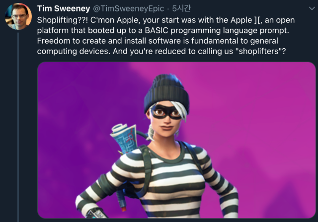 애플이 에픽게임즈의 행위를 "마치 가게에서 물건을 집어 들고 계산하지 않은 채 떠나는 것과 같다"며 '좀도둑(shoplifters)'에 빗댄 내용이다.