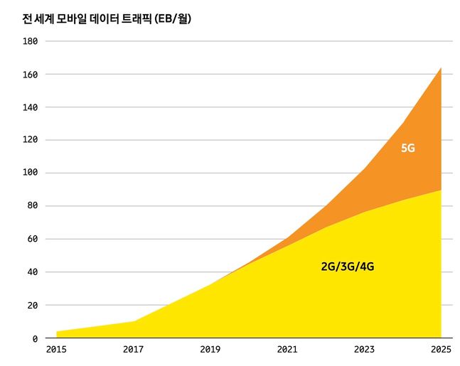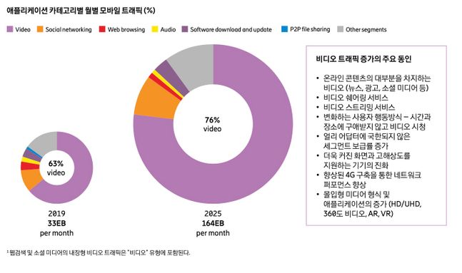 에릭슨엘지에 따르면 모바일 동영상 트래픽은 2025년까지 매년 30% 정도 증가할 것으로 예측된다. 동영상이 모바일 데이터 트래픽에서 차지하는 비율은 지난해 약 60%였으나, 2025년에는 약 4분의 3을 차지할 전망이다.