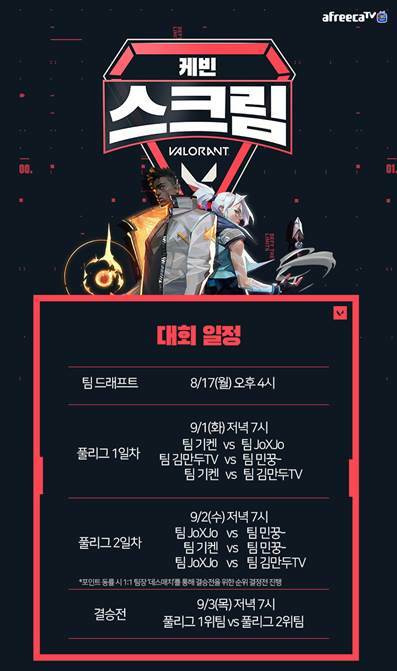 대회는 3일간 매일 오후 7시부터 아프리카TV 발로란트 공식 방송국에서 라이브로 생중계된다.