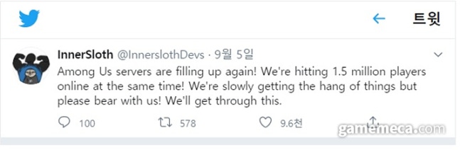 ▲ 어몽 어스 동시접속자 150만 명을 알린 공식 트위터 (사진출처: 이너슬로스 공식 트위터)
